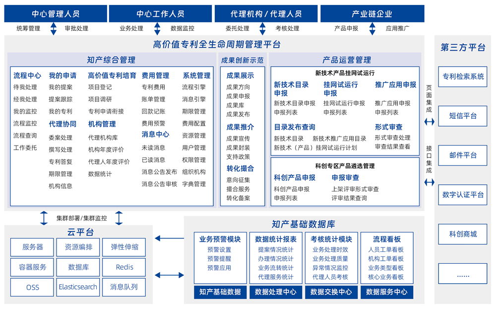 高質量專利全生命周期管理平臺,推動核心技術、創新技術的知識產權的管理,完善保護體系及手段、提升精細化管理能力、推動高效轉化運用服務,提升企業內外一體化協作服務水平,提升以關鍵技術、創新技術為核心的知識產權精細化管理、高效益轉化運用及全鏈條服務水平。