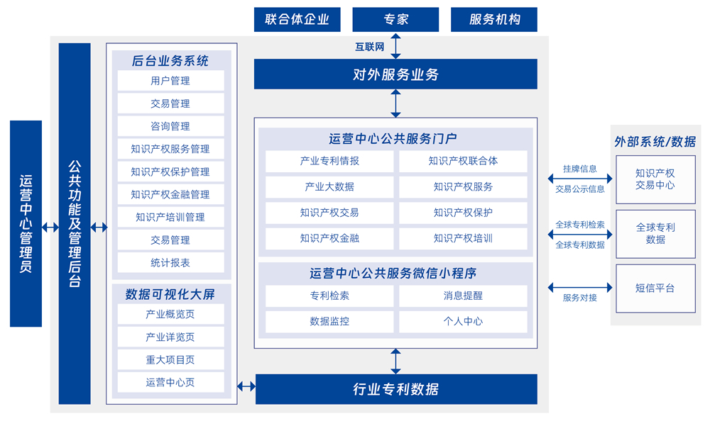 產業知識產權運營支撐平臺以數字化創新技術輔助提升產業知識產權創造、運用、保護、管理和服務水平,平臺采用“一庫四中心”模式,即產業專利專題庫和數字支持中心、創新服務中心、運營交易中心、交流合作中心,采用數字化驅動產業知識產權運營,推動產業知識產權多元化保護,支撐推動開發許可落地實施,多渠道推動產業運營高質量發展,持續構建多放共贏的產業運營生態圈。