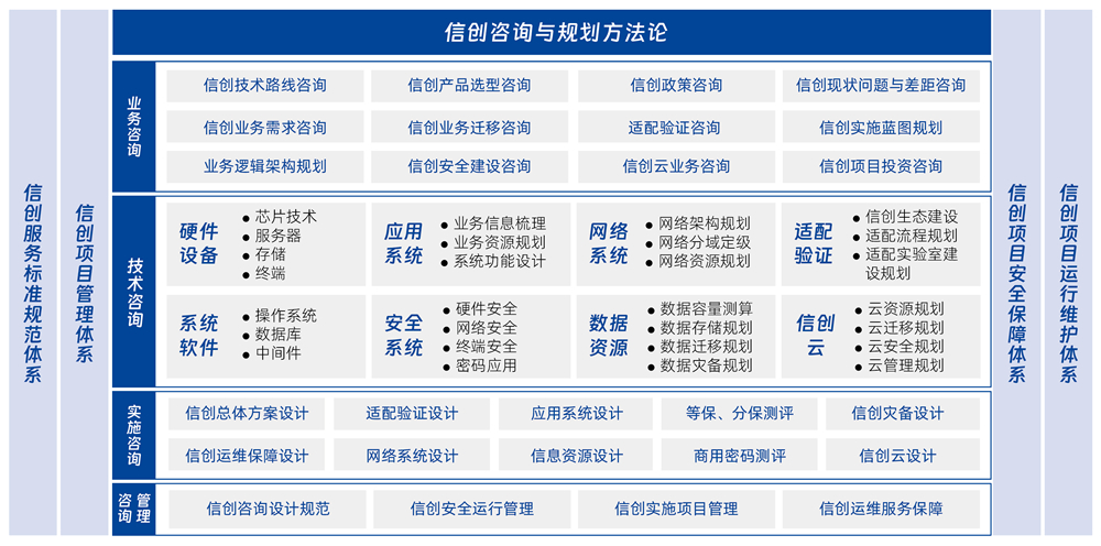 神州信息依托十多年為黨政、金融、教育等行業(yè)客戶信創(chuàng)服務(wù)經(jīng)驗(yàn),運(yùn)用系統(tǒng)工程咨詢方法論,從頂層設(shè)計(jì)開始,為客戶提供全方位的信創(chuàng)咨詢與規(guī)劃服務(wù)。通過頂層設(shè)計(jì)為各行業(yè)用戶提供信創(chuàng)業(yè)務(wù)規(guī)劃設(shè)計(jì)、信創(chuàng)應(yīng)用遷移適配,信創(chuàng)項(xiàng)目集成實(shí)施,信創(chuàng)云、信創(chuàng)安全建設(shè)、信創(chuàng)智能運(yùn)維保障等方向的一站式信創(chuàng)咨詢服務(wù)及解決方案。