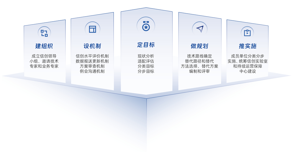 分步推進現狀摸底、分類梳理、實驗評估、路徑選擇、架構設計、方案編制、產品匹配等 環節,保障信創替代真正落地。
